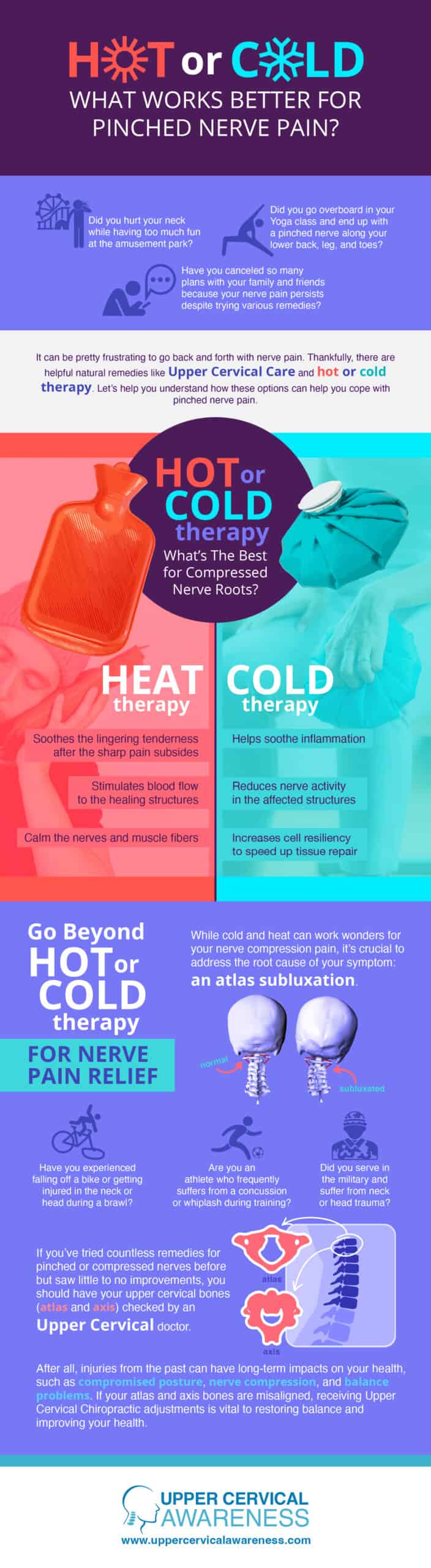 Are you struggling with persistent nerve pain after an injury or strain? Discover effective relief strategies with insights from a leading chiropractor in Honolulu. Our infographic delves into the age-old question: Hot or Cold – Which Works Better for Pinched Nerve Pain? Whether your discomfort stems from a day of thrilling adventures at the amusement park or an intense Yoga session resulting in a pinched nerve affecting your lower back, leg, or toes, finding respite is crucial. Constantly battling nerve pain can disrupt your life and hinder your plans. Our infographic also aims to shed light on the best option you can explore to alleviate pinched nerve discomfort.